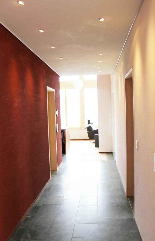 Boden | 2. OG: Eichen Schlossdielen in Raumlänge / Andeerer Naturstein 1. OG: Lattung schwimmend / Holzfaserplatten EG: Bestehender Betonboden |