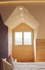 Dach | Ziegelbedachung Hinterlüftung: Statik Holzelemente / Holzflexisolation Gipsplatten Luftschall (Fluglärm) Holzfaserplaten Installationsebene: Tannenholzplatte geseift, weiss |