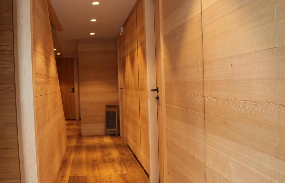 Wände | alle Wände mit liegendem Täfer, stumpf aneinander, sägeroh gebürstet |
