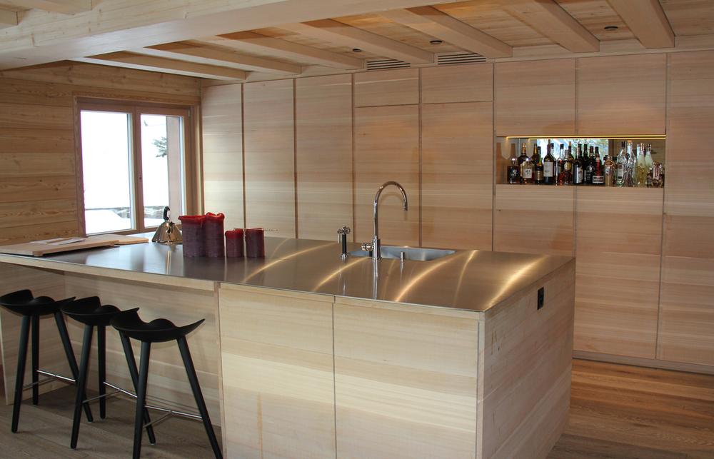 Küche | Abdeckung in Chromstahl 4 mm dick gebürstet Holzküche in Lärche, liegende Struktur sägeroh gebürstet Ohne vorstehenden Griffe (integriert) |