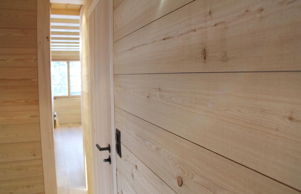 Türen | Flächenbündige Türen mit Wand/Türblatt/Zarge; somit kein Band sichtbar, Türzarge in Tanne, von Hand geschroppt Drücker von Hand geschmiedet, eisenfarbig |