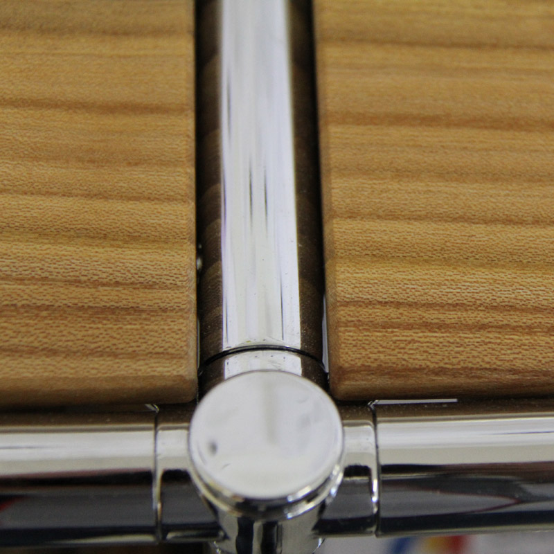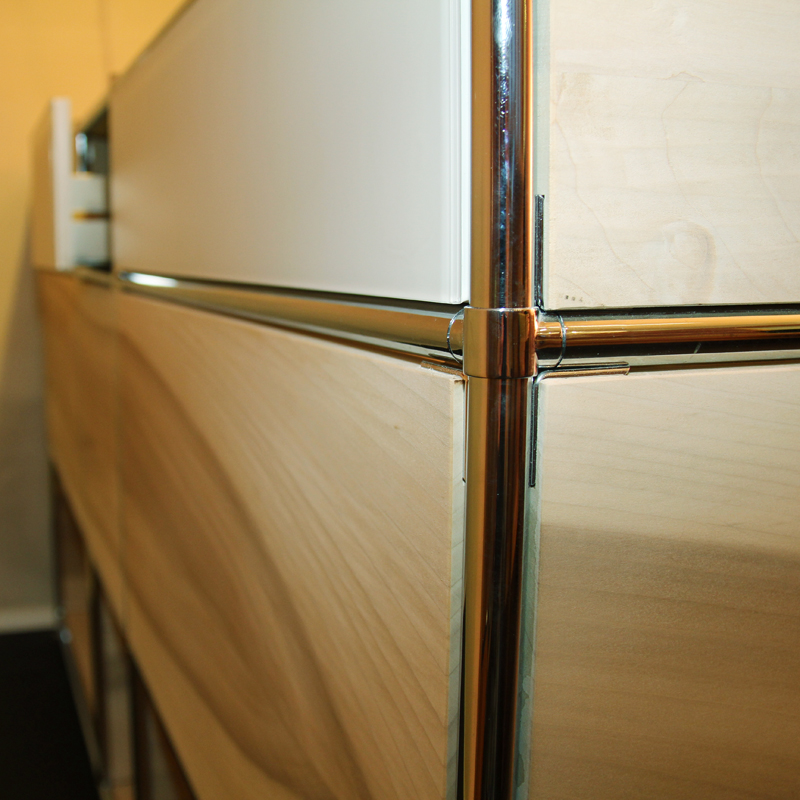 Das modulare Trägersystem besteht aus präzisen und hochwertig verchromten Feinguss-Verbindungselementen. Es sind keine Gewinde und Schrauben sichtbar.