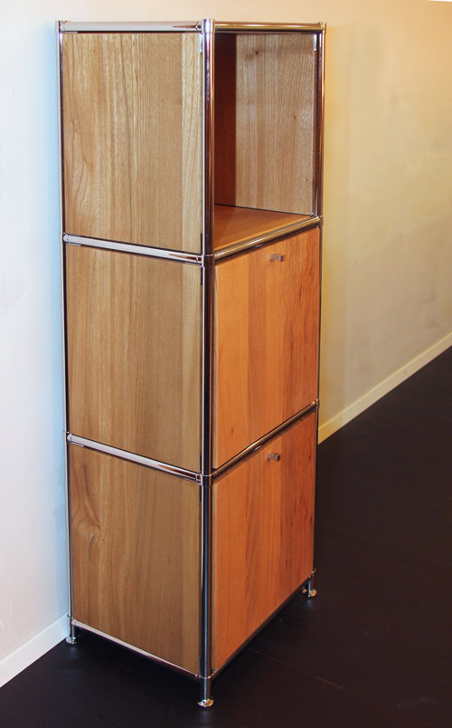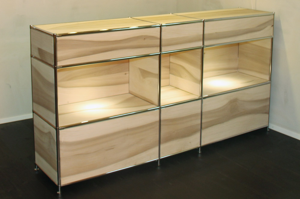 Die Tablare und Deckelemente sind aus Massivholz in Natur oder nach RAL oder NCS Farben erhältlich. Selbstverständlich gibt es dazu auch Auszugsschubladen. Die Belastung ist max. 30 kg. Diese sind rollengelagert und mit Dämpfer als auch mit Selbsteinzug ausgerüstet.